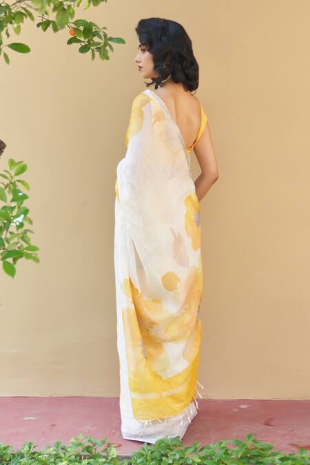 Yellow floral print linen saree featuring weaving details. Comes with a running blouse piece.