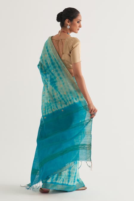 Beige saree featuring shibori pattern with gold border and polka dots. Comes with unstitched blouse piece in matching fabric.