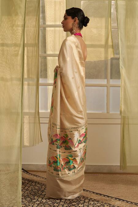 Ivory Kota Doria Embroidery Birds And Paithani Woven Saree