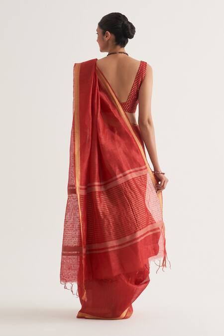 Red Silk, Linen Paro Stripe Pattern Saree With Unstitched Blouse Piece