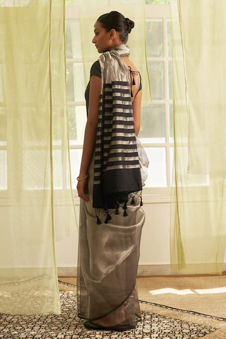 Silver tissue saree featuring thick stripes on the pallu and tassel details. Comes with a running blouse piece measuring approximately 1 meter in length.