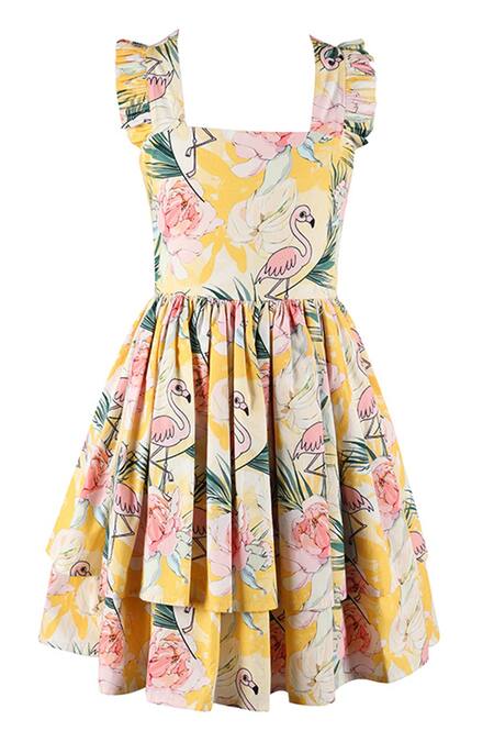 Multicolor dress with flamingo printed motifs & pleated sleeve hem.