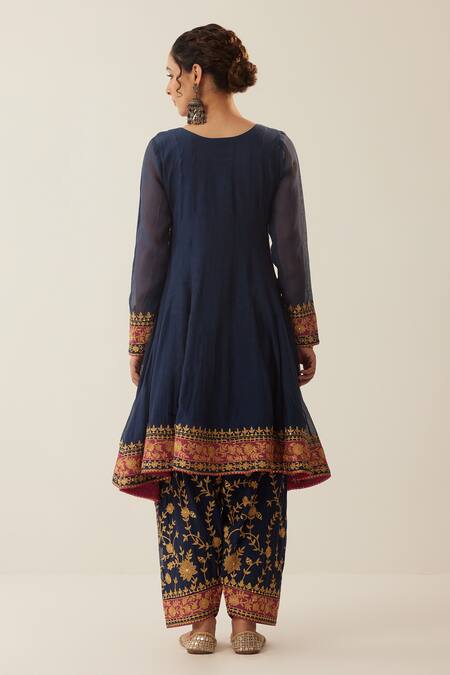 Blue Chanderi Silk Embroidered Aari Round Flared Anarkali Set With Salwar