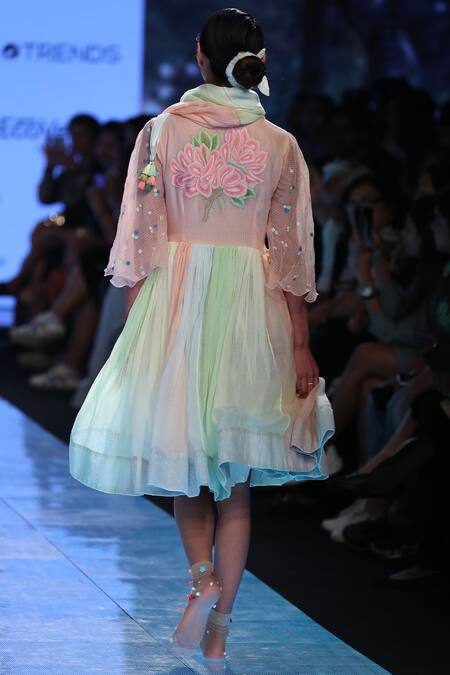 Buy_Gazal Mishra_Multi Color Kota Doria V Neck Flared Midi Dress_at_Aza_Fashions