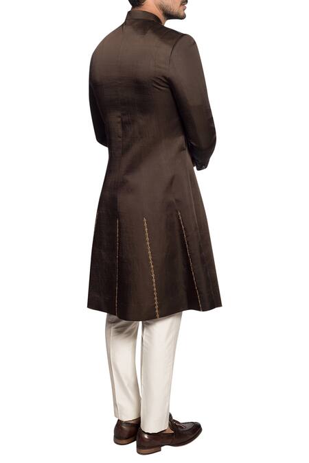 Buy_More Mischief_Brown Linen Silk Embroidered Zardosi Flared Sherwani Set _Online_at_Aza_Fashions