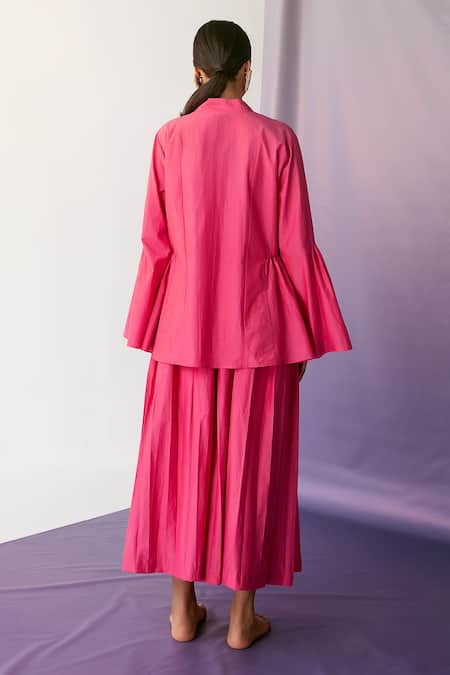Pink Cotton Silk Band Collar Flared Sleeves Jacket And Pant Set