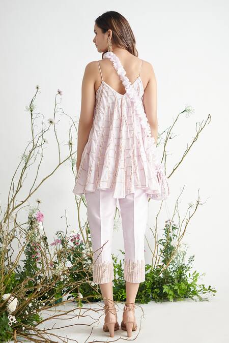 Lilac flared top with all-over hand embellishments, noodle strap & uneven hem. Comes with cropped pants.