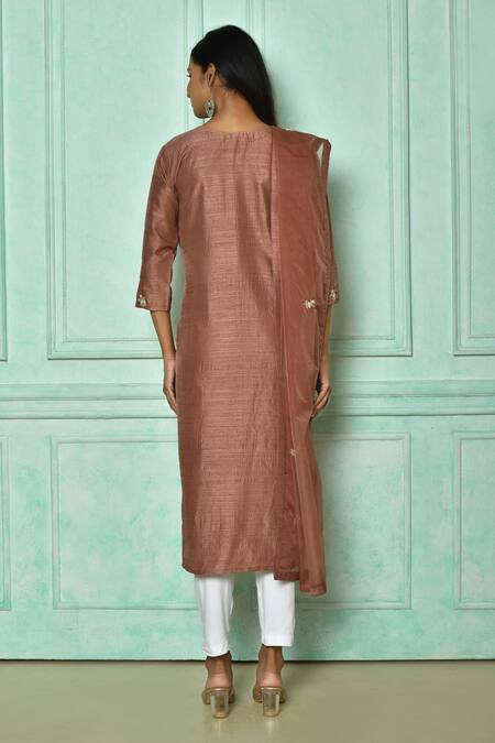 Purple kurta featuring floral embroidery, round neckline, and three-quarter sleeves. Paired with an embroidered dupatta.