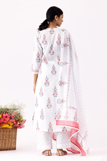 Ivory Cotton, Muslin Lace, Embroidery V-neck Floral Block Print Kurta Set