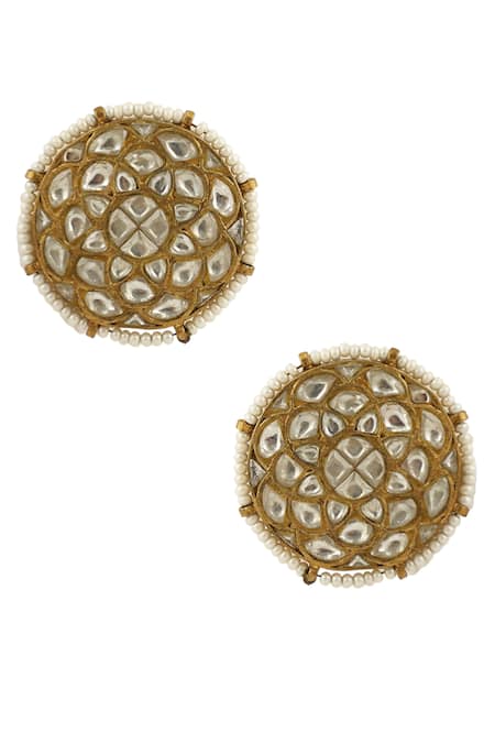 Gold stud earrings featuring a floral carved design adorned with glass beads, semi-precious pearls, and real jadtar stones