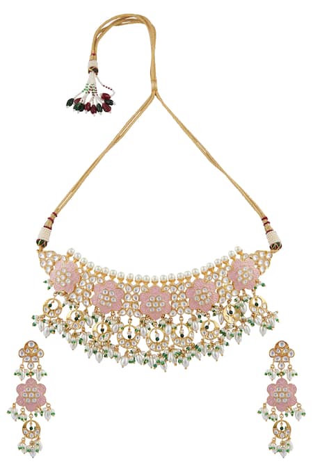 Floral carving on choker and earrings, Bead drop details on choker, Semi-precious stones embellishments