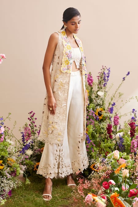 Ivory Chanderi Embroidery, Cut Work Floral Bell Bottom Pant