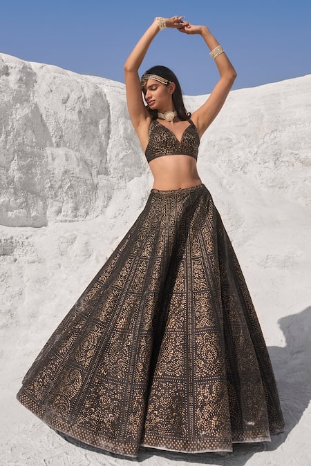 Black Leather, Organza, Silk Cut Work Floral Cut-work Detail Lehenga Set