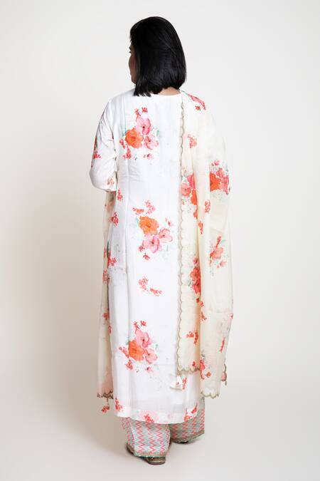 Ivory and red digital floral print kurta with embroidered detail. Paired with printed palazzo and dupatta.