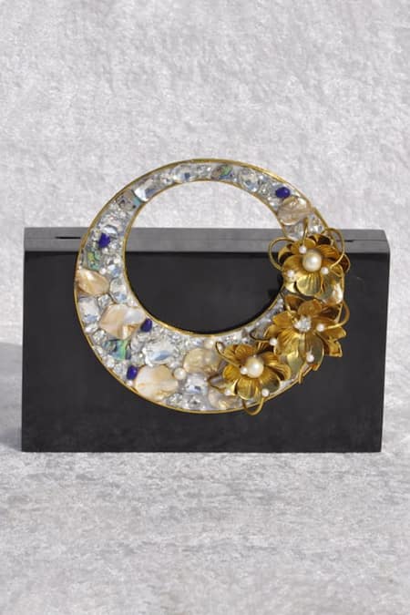 Black rectangular clutch featuring floral embellishments and a gold circular handle