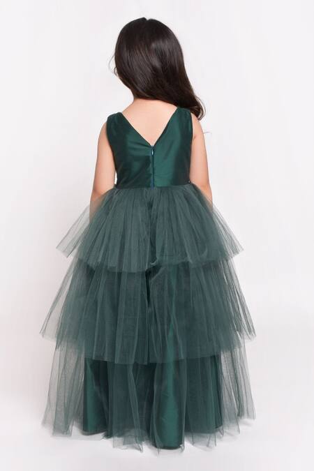 Green Net Fabric Flowers Tiered 3d Floral Embellished Gown