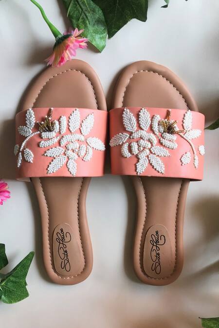 Buy_Sole House_Peach Embroidered Floral Embellished Sliders_Online_at_Aza_Fashions
