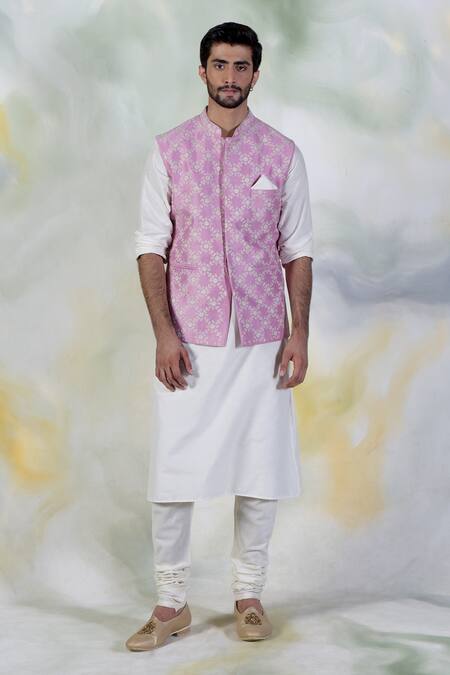 Onion pink bundi with floral embroidery in geometric pattern.