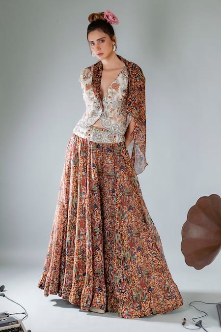 Ivory floral embroidered jacket style padded blouse with attached drape. Paired with a printed lehenga featuring attached cancan.