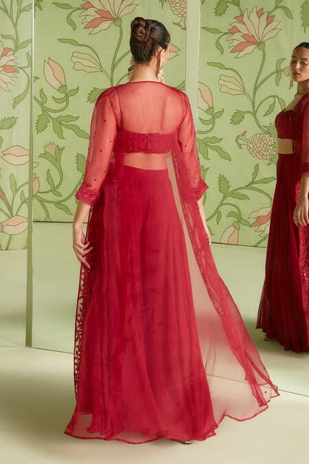 Buy_Sanjev Marwaaha_Red Organza, Georgette Bead Work, Cutdana Floral Embroidered Jacket Pant Set_Online_at_Aza_Fashions