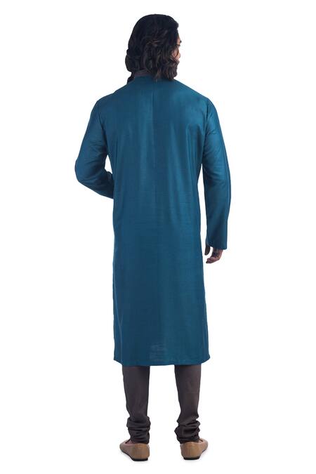 Blue kurta with floral embroidered yoke & band collared neckline. Paired with brown churidar.