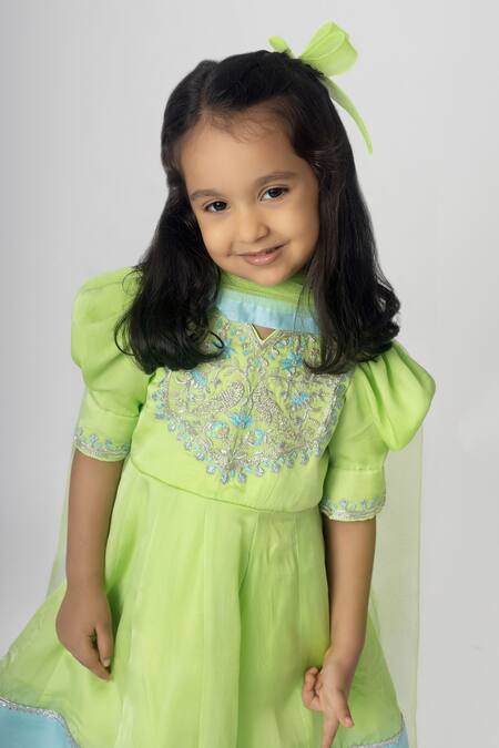 Green kurta featuring floral embroidery on the bodice and notched neckline. Paired with cowl pant and gota bordered sheer dupatta.