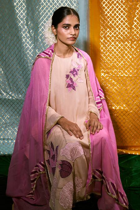 Peach Muslin Silk And Organza Sequin, Cutdana & Floral Embroidered Kurta Set