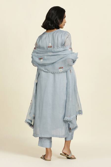 Buy_Oshi By Shikha_Blue Silk, Kota Doria Embroidery, Sequins V-neck Floral Kurta Set_Online_at_Aza_Fashions