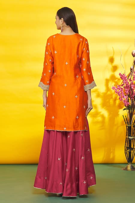 Buy_Surbhi Shah_Orange Silk, Organza Embroidery Round Neck Floral Kurta Sharara Set _Online_at_Aza_Fashions