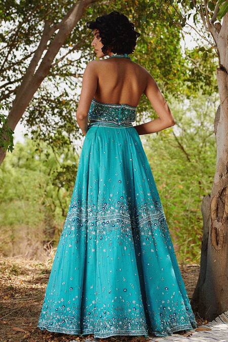 Cyan georgette hand embroidered lehenga with floral sequins and bead work. Paired with embroidered halter neck choli and dupatta.