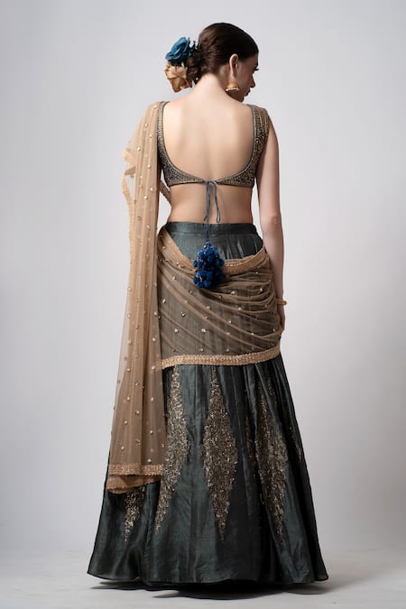 Steel grey raw silk lehenga with diamond motif embroidery. Paired with embroidered blouse & gold beige embroidered dupatta.