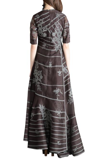 Brown Organza Embroidered Floral Motif Round Maxi Dress