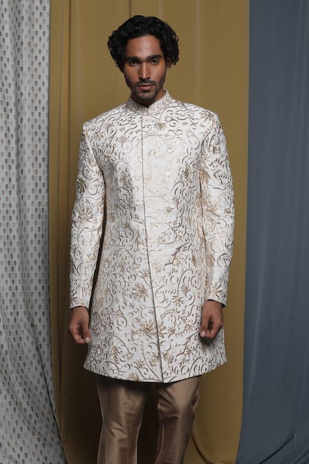 Buy_Krishna Mehta_White Cotton, Viscose Embroidery Floral Sherwani And Pant Set _Online_at_Aza_Fashions