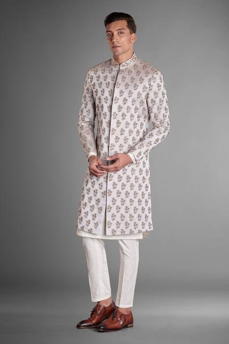 Buy_More Mischief_Grey Silk, Linen Embroidery Floral Sherwani Set_at_Aza_Fashions