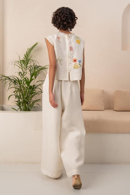 Ivory top featuring a pleated neck and floral sequin embroidery on the yoke. Paired with relaxed fit linen pants with side pockets.