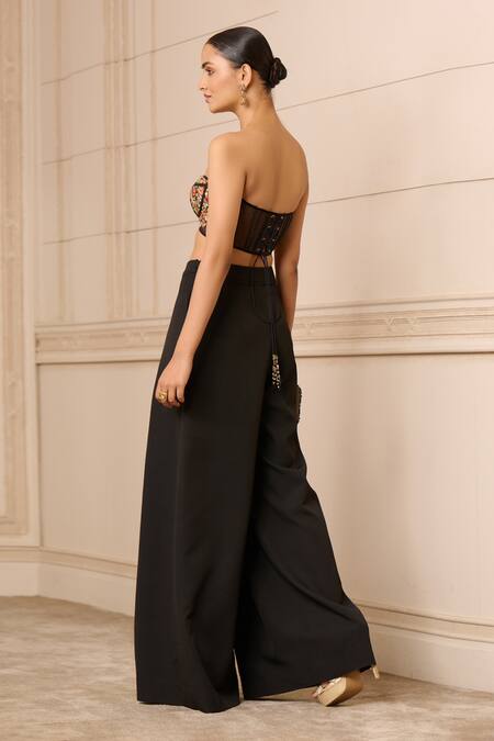 Black bustier featuring multi-colored hand-embroidered botanical motifs. Paired with wide-legged trousers made from banana crepe fabric.