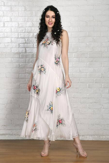 Buy_Whimsical By Shica_White Silk Embroidery Boat Neck Floral Hand Painted Dress_Online_at_Aza_Fashions
