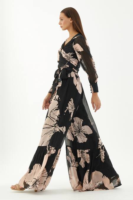 Pink and black jumpsuit in chiffon base with all over floral pattern.