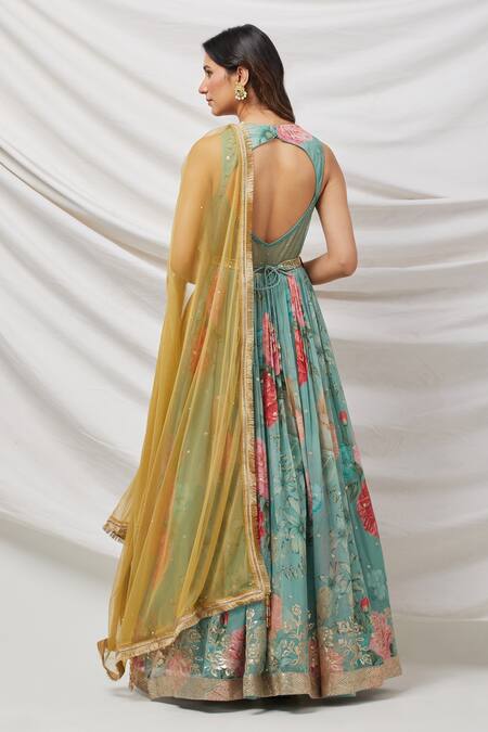 Buy_Basanti - Kapde Aur Koffee_Green Georgette, Dupatta Net, Lining Floral Pattern Sleeveless Anarkali With_Online_at_Aza_Fashions