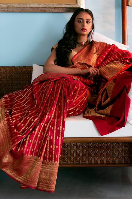 Maroon and red pure banarasi satin silk woven saree featuring a floral pattern. Comes with unstitched blouse fabric.