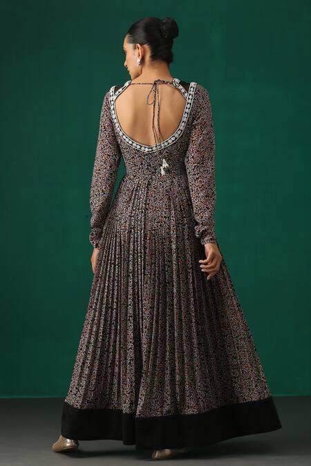 Black anarkali with multi colored floral prints. Comes with ruffle dupatta & embellished belt.