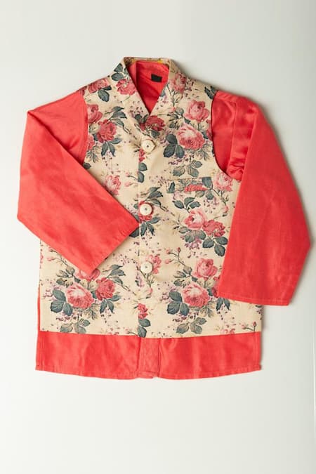Beige bundi featuring floral print and mandarin collar. Paired with coral full-sleeve kurta and cream pant with elasticated waistband.