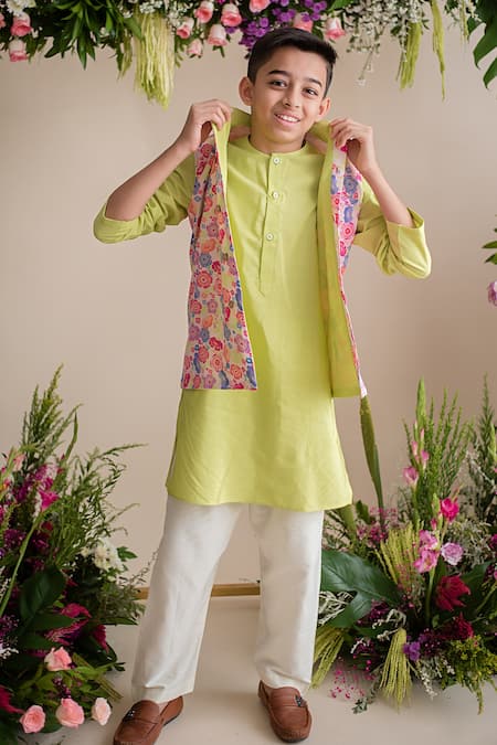 Green kurta featuring a round neckline and rolled-up sleeves. Paired with a floral print bundi and cotton silk pant.