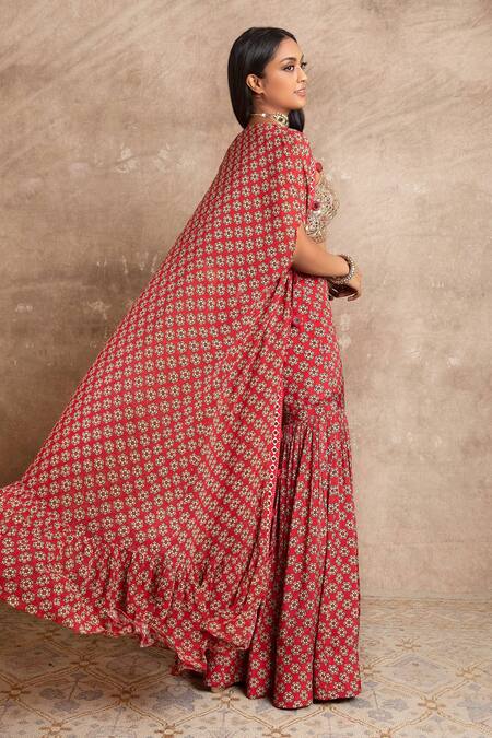 Buy_Arpita Mehta_Red Floral Print Cape And Sharara Set_at_Aza_Fashions