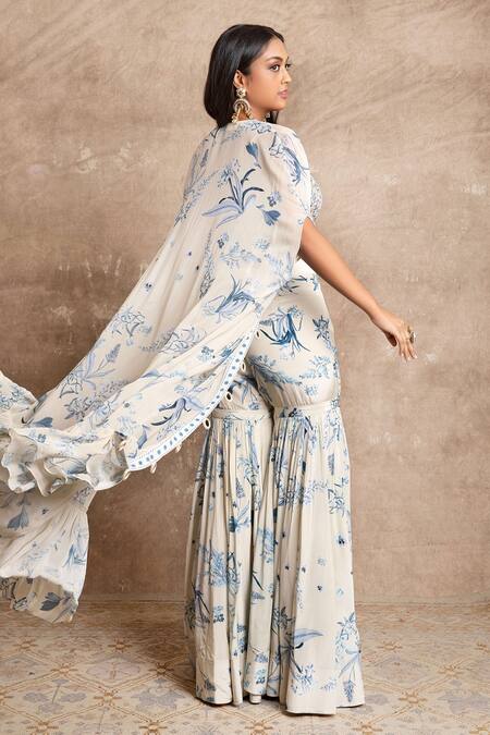 Seashore cape with floral print & mirror embroidered border. Paired with printed sharara & embroidered blouse.
