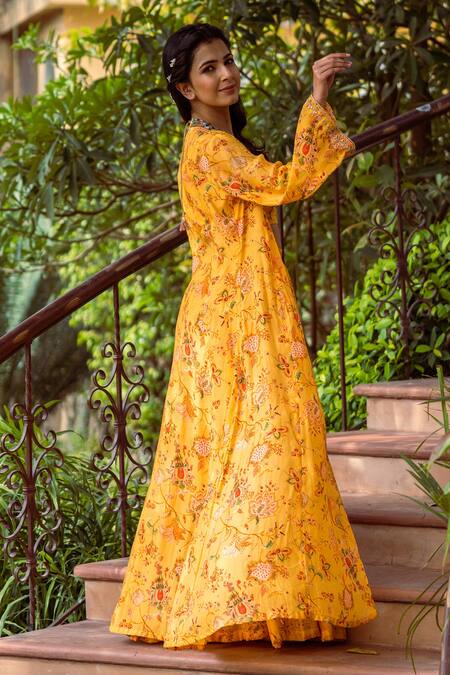 Yellow open front jacket with floral printed motifs and lace trim on sleeve hems. Comes with crop top and skirt.