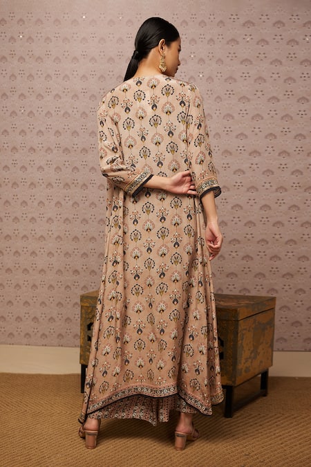Beige Crop Top And Palazzo Crepe & Jacket Organza Floral Print, Sarouk & Set
