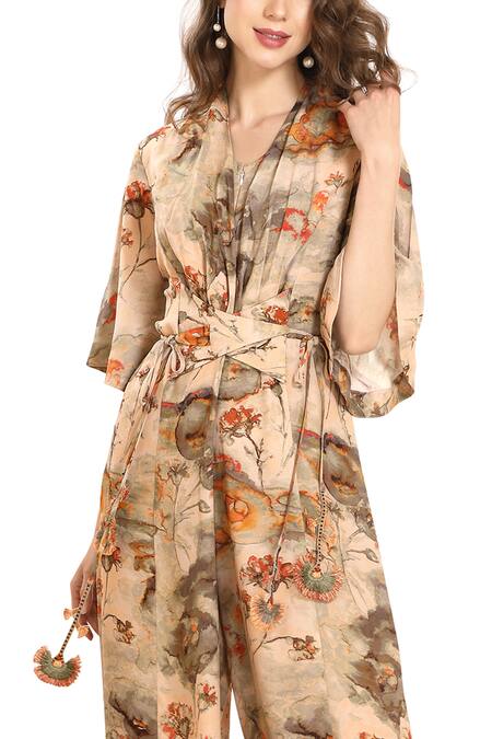 Green floral watercolour print jumpsuit with a wrap bodice, cuffed sleeves and hand made tassels.