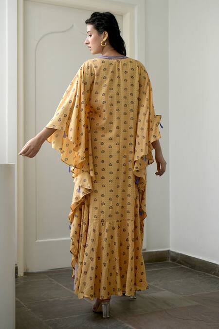 Mustard kaftan tunic with printed floral motifs & polka dots, lilac tassels & contrast neckline.