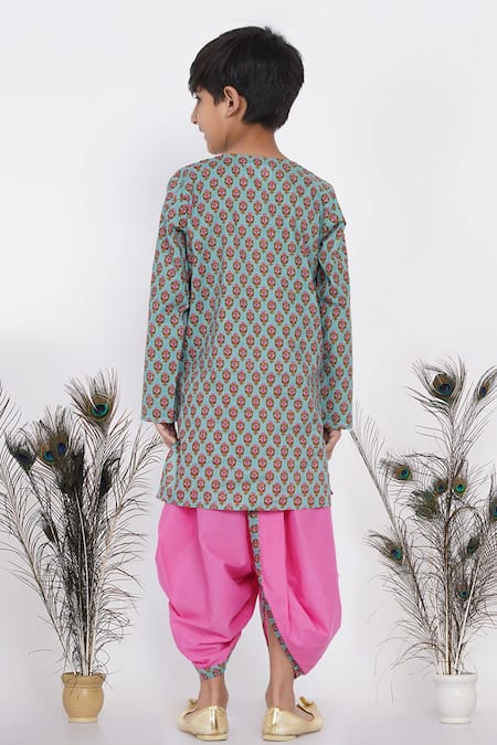 Blue floral print kurta featuring a round neckline and full sleeves. Paired with a pink dhoti pant with printed borders.